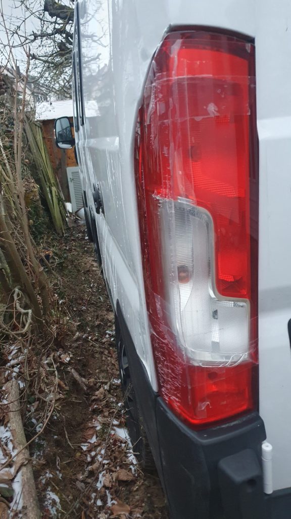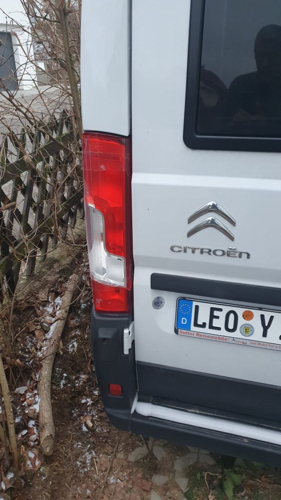 Das Fahrzeug bringt mal wieder eine Fehlermeldung beim losfahren. Reifendruck vorne links 4.8 Bar. Bitte kontrollieren. An zwei Tankstellen versuchen wir den Reifendruck zu prüfen aber der Druck von 3.5 bar schafft kein Gerät. Ein Mann hilft uns weiter und wir können den Druck testen. Nachdem alle Reifen korrekt 5.5 bar Druck haben fahre ich rückwärts und gegen einen Pfosten. Denke noch alles ist gut, steige aus und stelle fest, dass ich das linke Rücklicht kaputt gefahren habe. Zudem ist das Blech der Karosserie etwas verbeult und es gibt ein paar kleine Lackschäden.